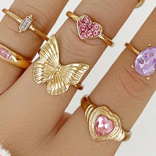 Y2K goldenes Ring Set mit rosa & lila zirconia Kristallen, 7 Stück