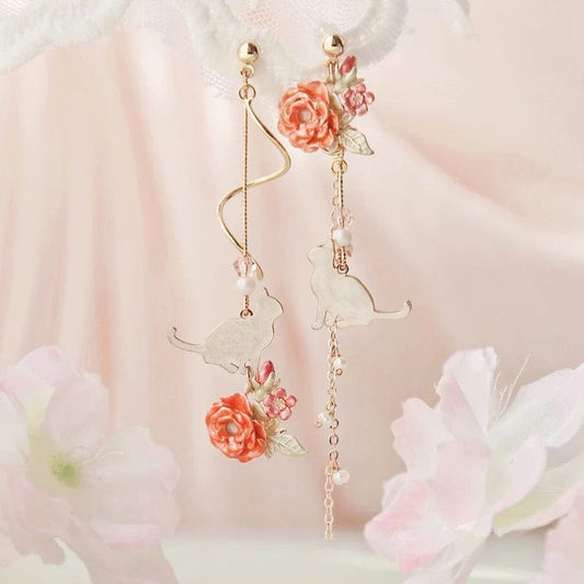Asymmetrische Rosen Katzen Ohrringe mit hängenden Blüten